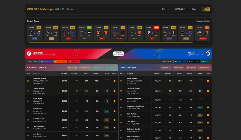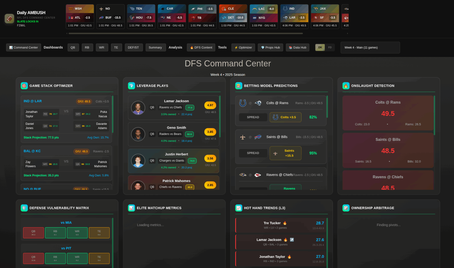 the Daily Ambush AMBUSH the Competition With Home-Grown Intelligence.Built for Players Who Want Sustainable Success, Not Screenshot Hype. Professional DFS Solutions at Reasonable Rates – Because Winning Consistently Matters More Than Winning Once Join Latest Articles NHLNHL DFS: The Slapshot – October 27thGOLFButterfield Bermuda ChampionshipNHLNHL Slapshot: Tue, October 26th Prev1 … 719 720 721 722 723 724 725 … 952Next The NFL Command Center 03. Our Sports We have advice and tools across various different sports throughout the calendar. Dashboards & Tools Automated and real-time updated Dashboards which are constantly finding the data & providing custom ratings Analysis & Advice MLB, NFL, College, PGA and NHL Advice year round. Discord Join our Discord and be part of the community with others who are real players and not just wanna be touts The original home of DFS Dashboards Our custom ratings and automaited “AI” dashboards are frequently used by users to quickly decipher slates for DFS and sports betting. CFB Dashboard Log In Username or Email Address Password Remember Me Show Password Lost Password? Click here